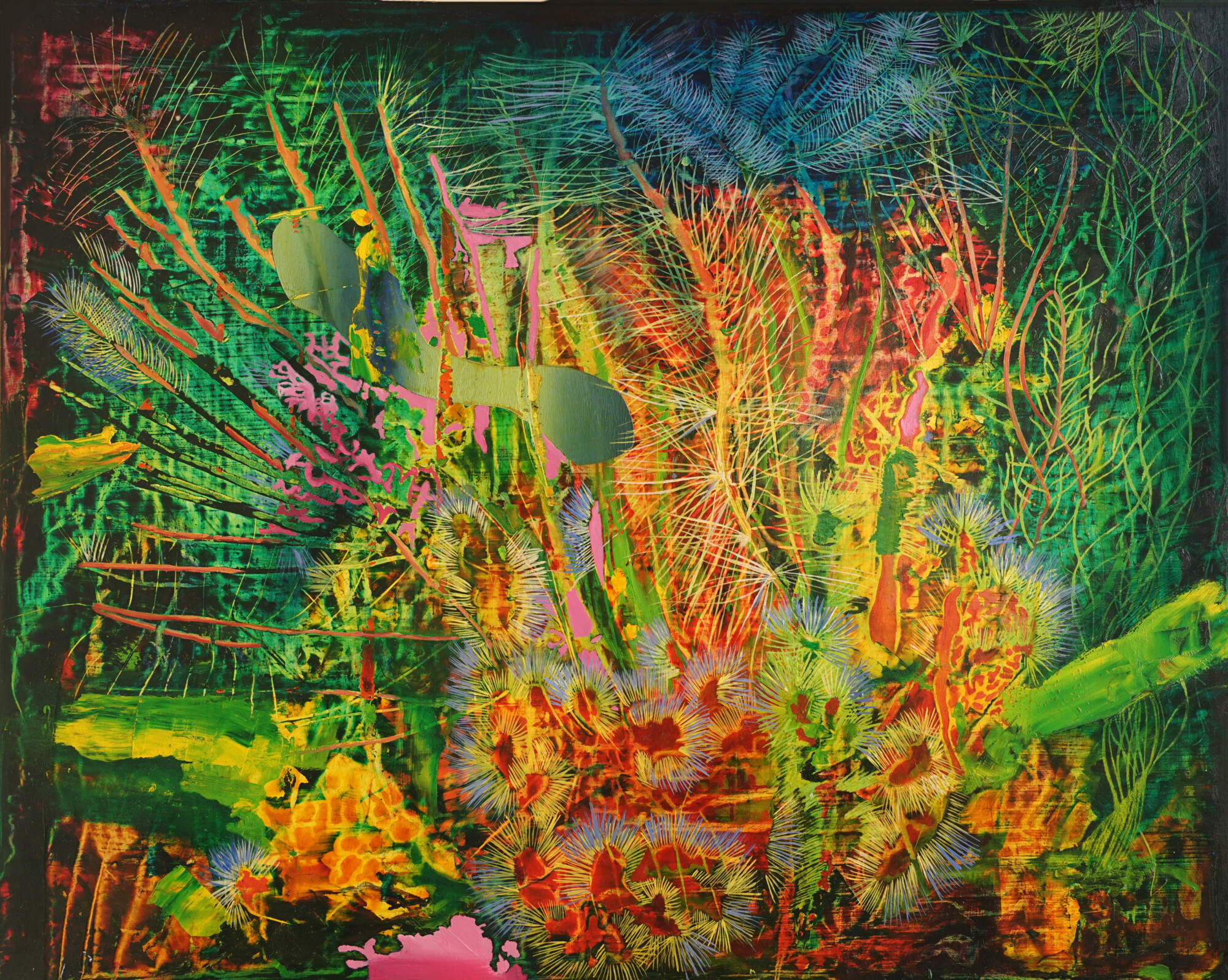 The name for the series, emerged from the square frames of wire usually placed on the ground by ecologists to study the distribution of living organisms in habitats, to look at the plants or slow-moving animals within them. Similarly, each panel is acting like a quadrat to study the behaviour of paint within every particular enclosure. This body of work is looking at the painting process as an action that behaves, reacts and adapts just like any other natural instinct. This can be recorded in the way the paint acts on the surface it is applied to, how it travels from brush to surface and how it responds to aggressive scratching and layering. Therefore by referring to motifs from nature, the painter recognizes the nature within him. Working from within, the painter memorizes the profusion found in nature and reassembles it in a new world of pictorial harmony. As a result the painter embodies the role of a listener and messenger. Firstly, he surrenders to the nature of the painting process, he responds to the context surrounding him, he extracts from it and lastly, through gestures and mark making he rearranges memories into matter. These actions, reactions and translations constitute the ‘nature of painting’. Just like any living organism that transmutes energy into plenitude, so does the painting process. Similarly, the work encapsulates the transfer of energy from lived experience into matter